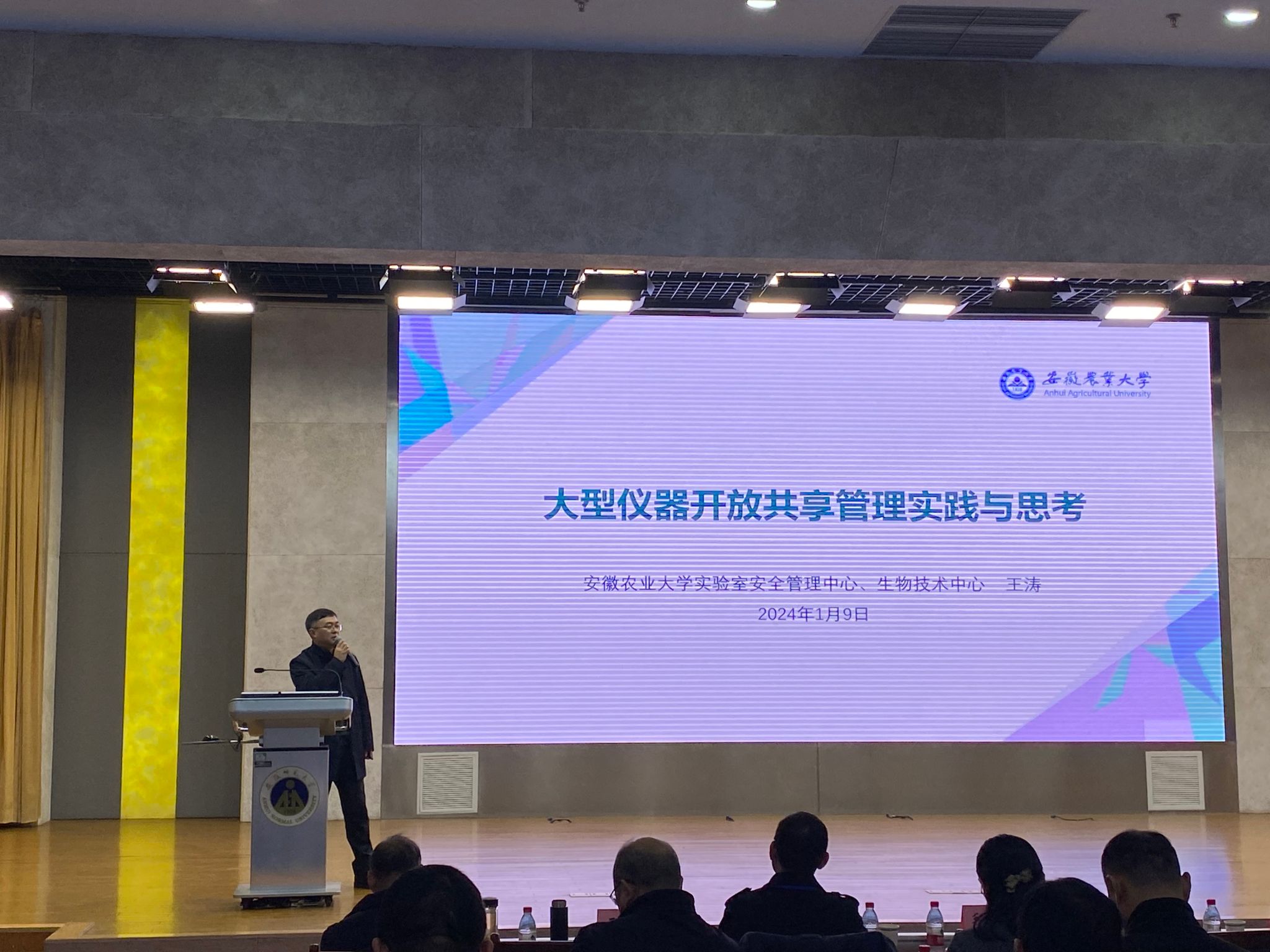 本次年会由安徽省高等学校实验室工作研究会主办,安徽师范大学承办,安徽师范大学党委副书记周旭、安徽省高等学校实验室工作研究会理事长薛照明等出席开幕式并分别致辞。会议邀请了省内外多所高校实验室管理部门领导及相关技术企业负责人参加,共奉献了8场精彩的专家报告。我校实验室安全管理中心、生物技术中心主任王涛受邀作了题为《安徽农业大学大型仪器开放共享管理实践与思考》的报告,从工作背景、工作实践和工作思考等方面详细介绍了我校大型仪器开放共享管理的发展现状,并对下一步工作进行了展望。同期还召开了2024年安徽省高等学校工作研究会全体理事会议。
